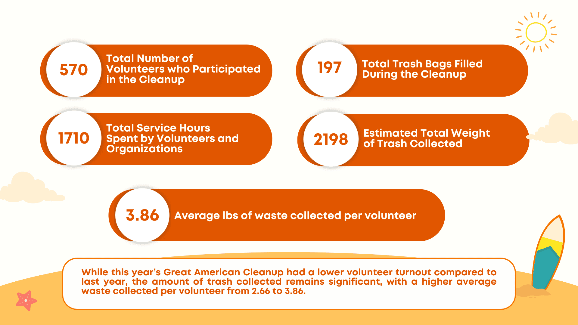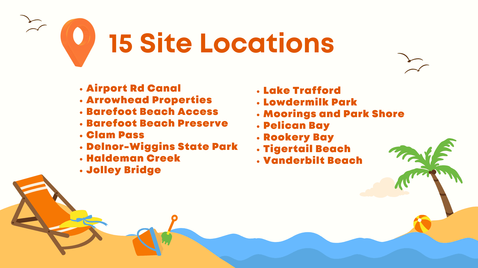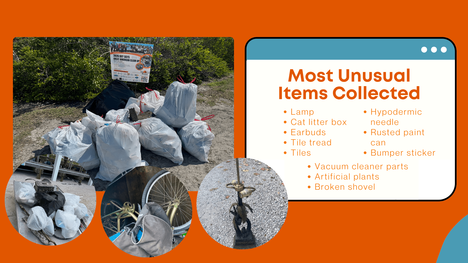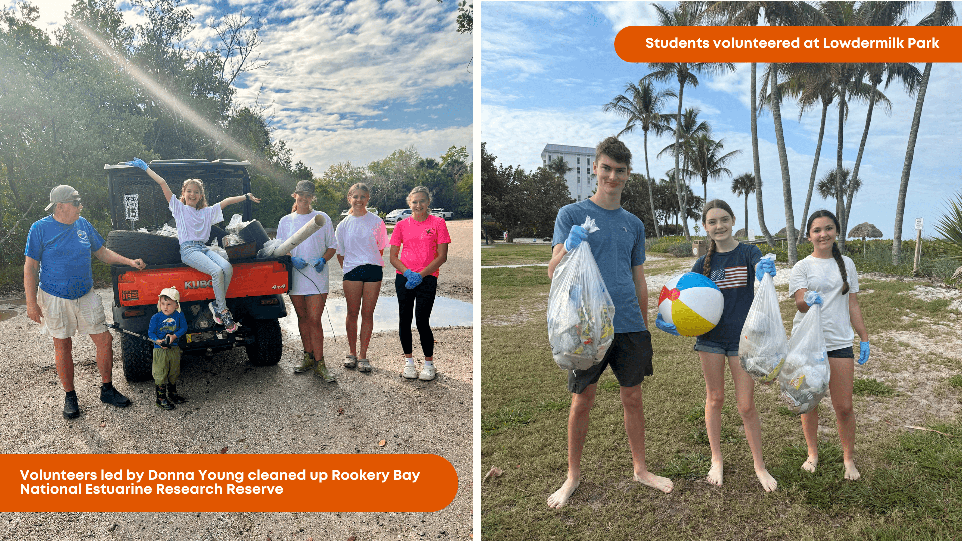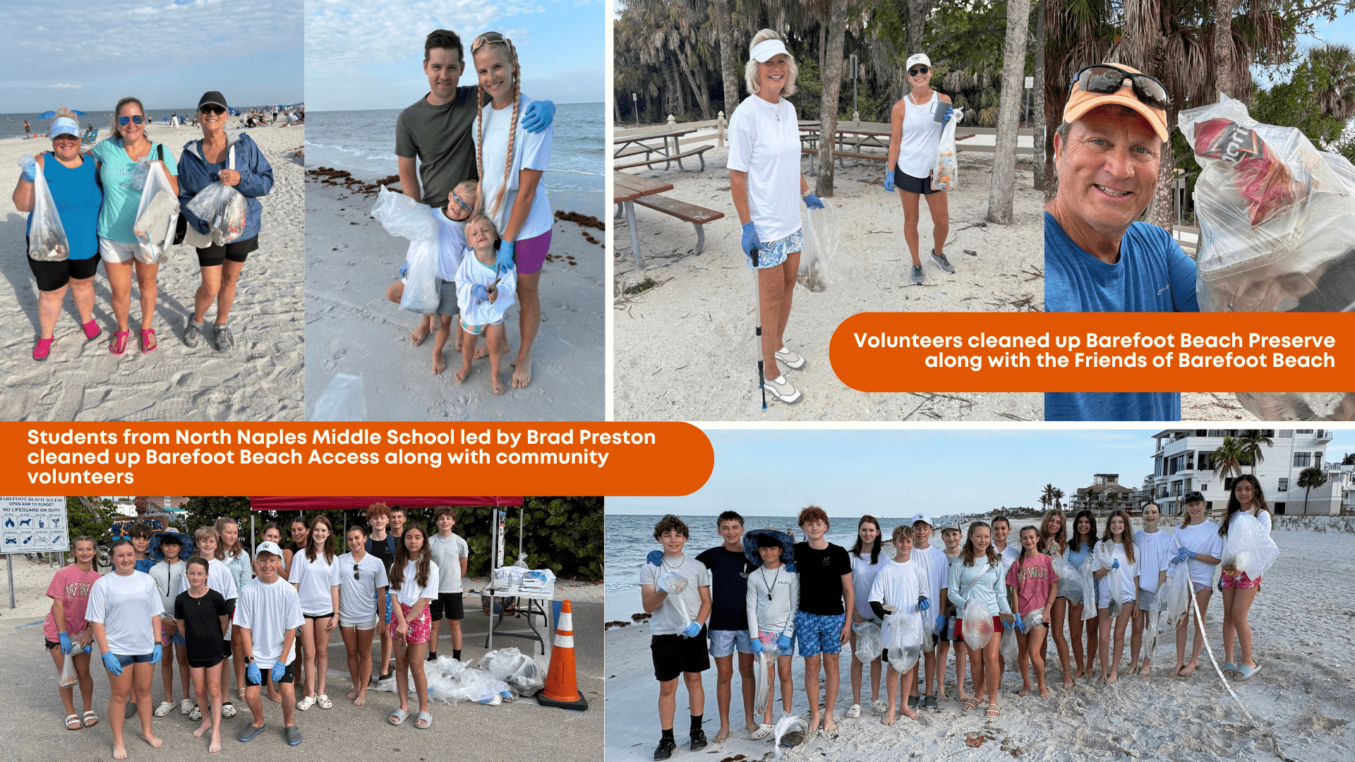 The event logged over 1,700 volunteer service hours to help clean Collier County’s beaches and waterways. Volunteers collected almost 200 trash bags of litter and debris from 11 public locations, including Barefoot Beach, Clam Pass, and Vanderbilt Beach, and 4 private sites such as Pelican Bay, Airport Rd Canal, and more. In addition to plastic and glass bottles, cigarette buts, and expected debris, volunteers found unusual items such as a lamp, a cat litter box, and vacuum cleaner parts. On average, 3.86 pounds of waste were collected per volunteer.