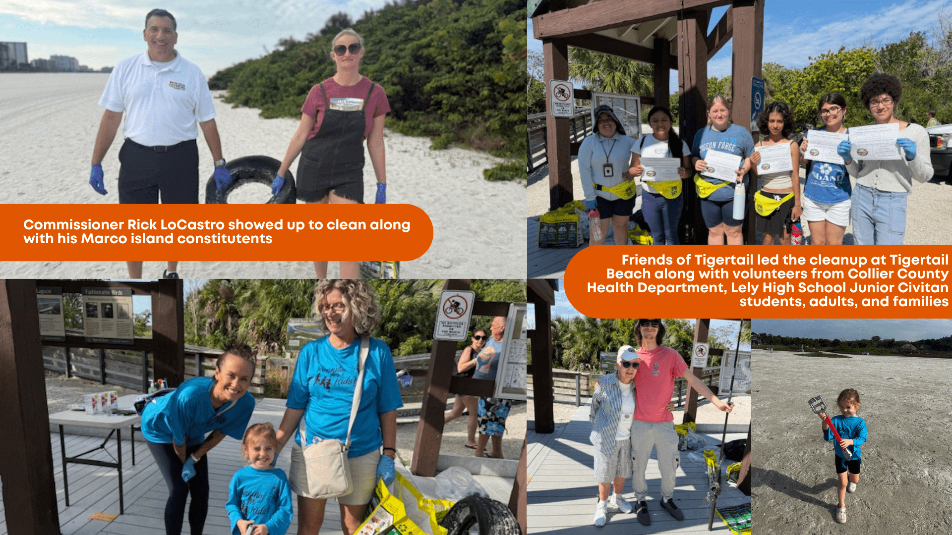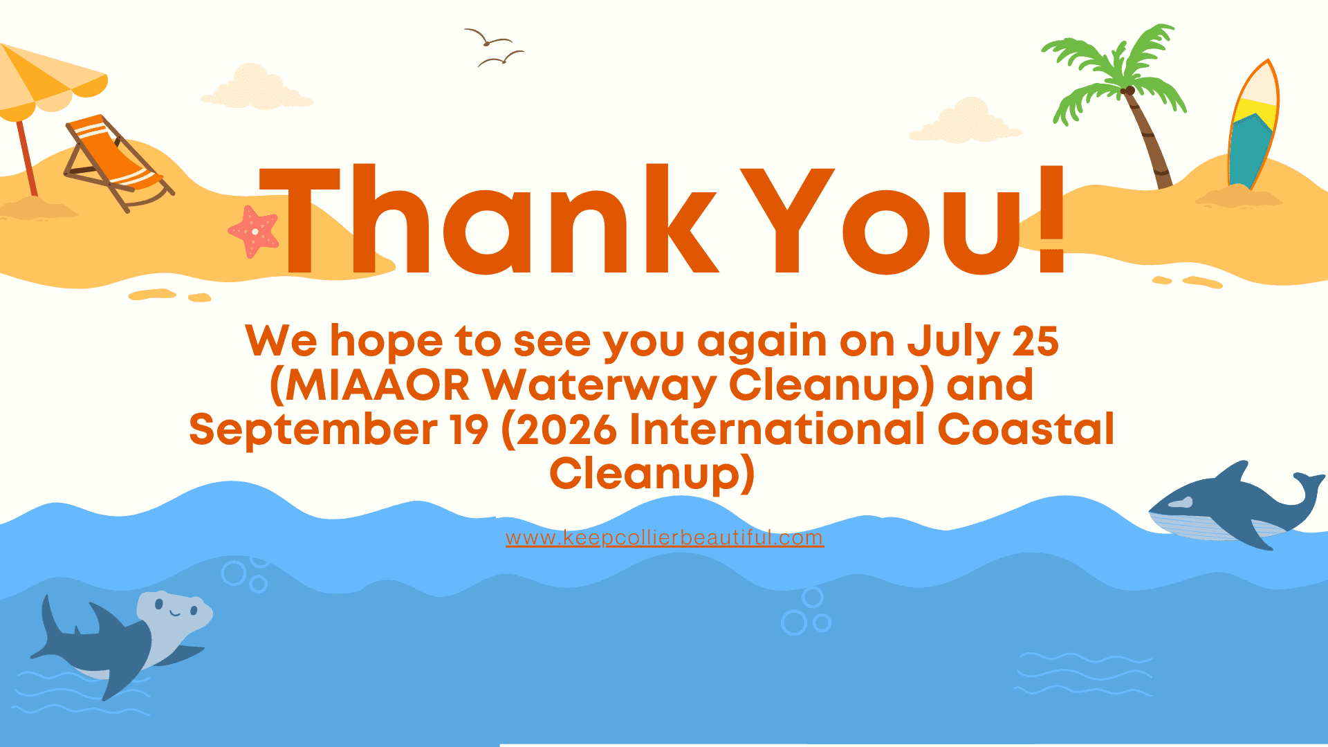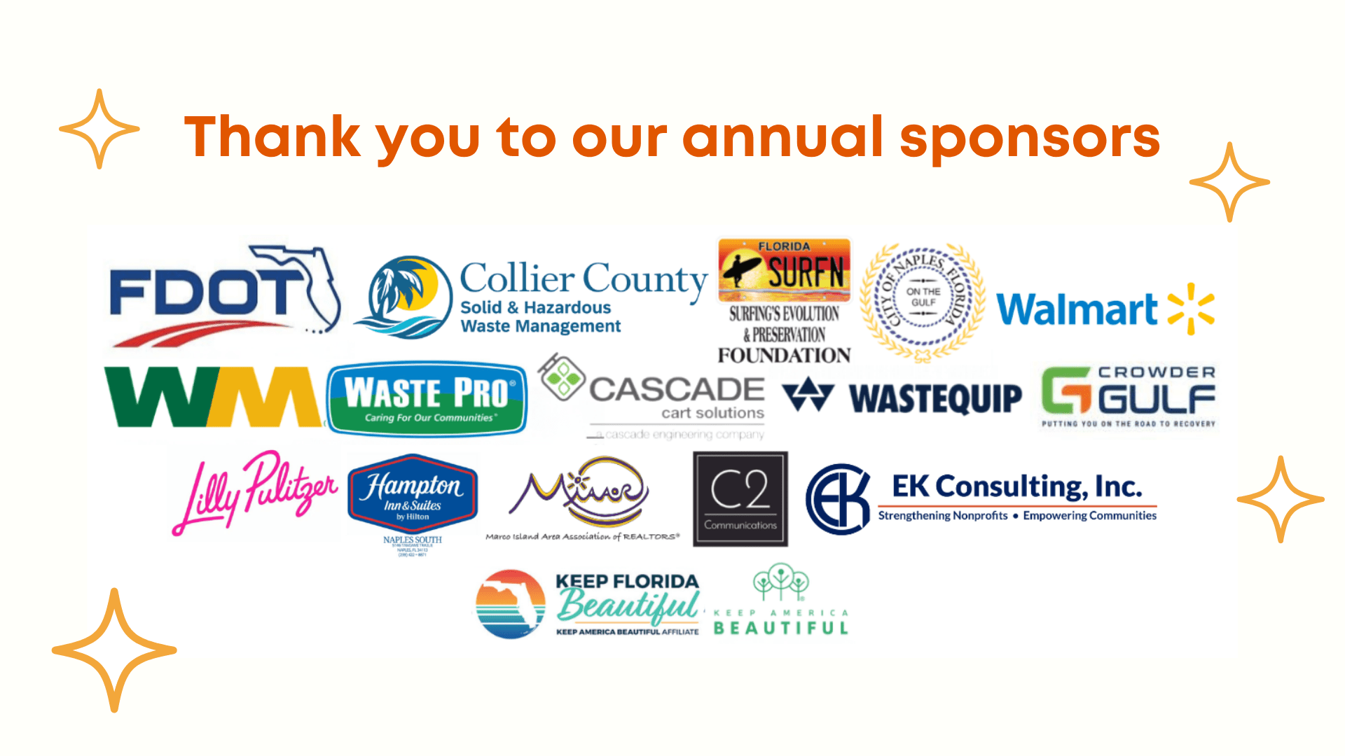 Keep Collier Beautiful would also like to express its gratitude to all the site captains for helping organize and distribute supplies to the volunteers and to all the sponsors and community partners who supported this cleanup event: FDOT, Collier County, City of Naples, Florida Surfn Foundation, Walmart Foundation, Waste Management, Waste Pro, Waste Equip, Cascade, CrowderGulf LLC, Lilly Pulitzer, Hampton Inn & Suites by Hilton Naples South, Marco Island Area Association of Realtors (MIAAOR), C2 Communications, and EK Consulting.