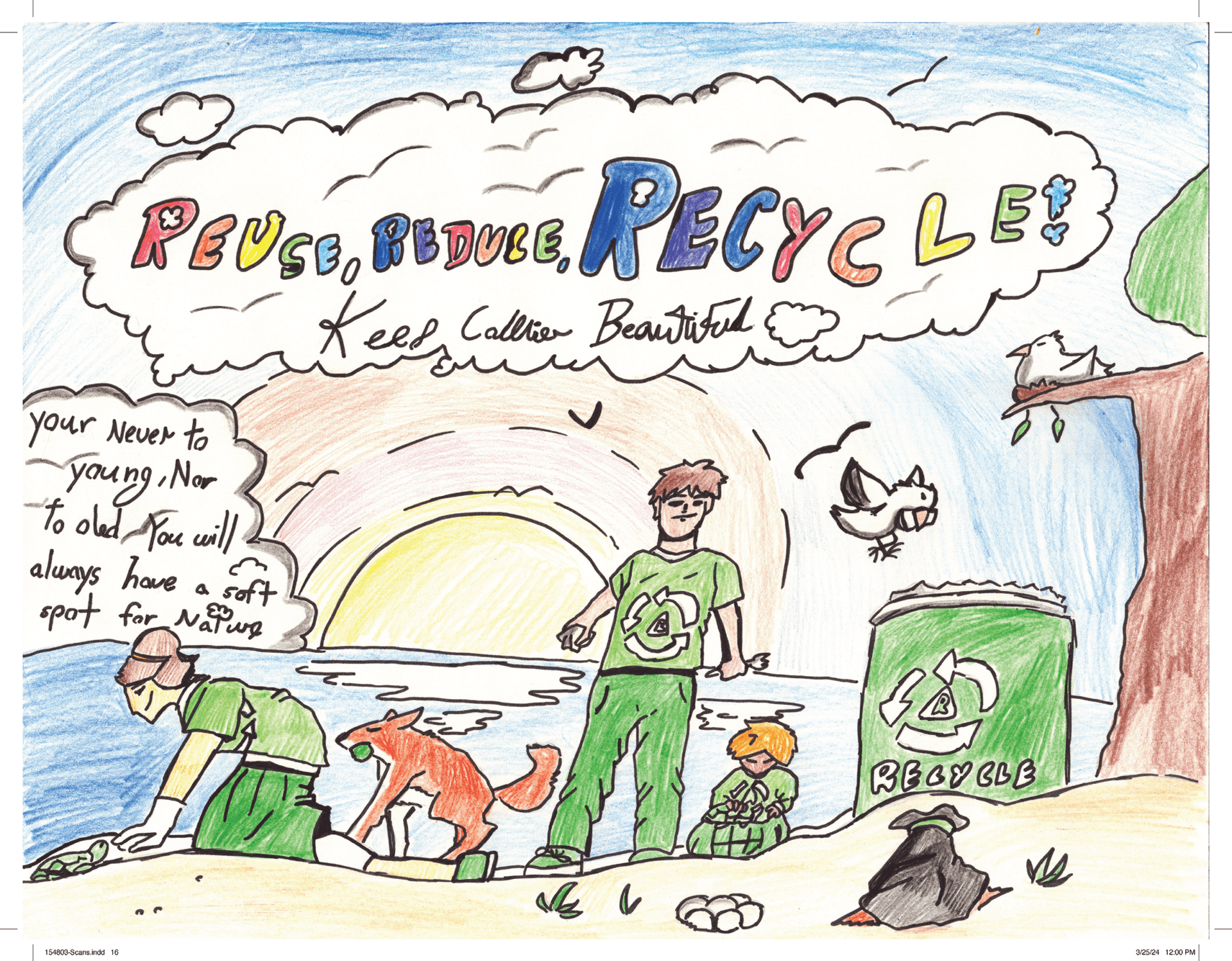 Through the annual KCB Calendar Art Contest partnership, Solid & Hazardous Waste Management visits Collier County’s K-12 schools to educate students about recycling, proper disposal, litter control and local initiatives to protect our environment. Students were invited to express themselves by submitting artwork for the art contest. More than 1,000 entries were submitted from Collier County students. Volunteer judges selected the top 14 winning entries for the front cover, back cover, and each month of the year. The 12 runner-up entries are also recognized. The winning pieces will be featured in KCB’s 2025 calendar, which will be released in September of 2024. Community members can request a copy of the calendar by sending a request to recycling@colliercountyfl.gov.